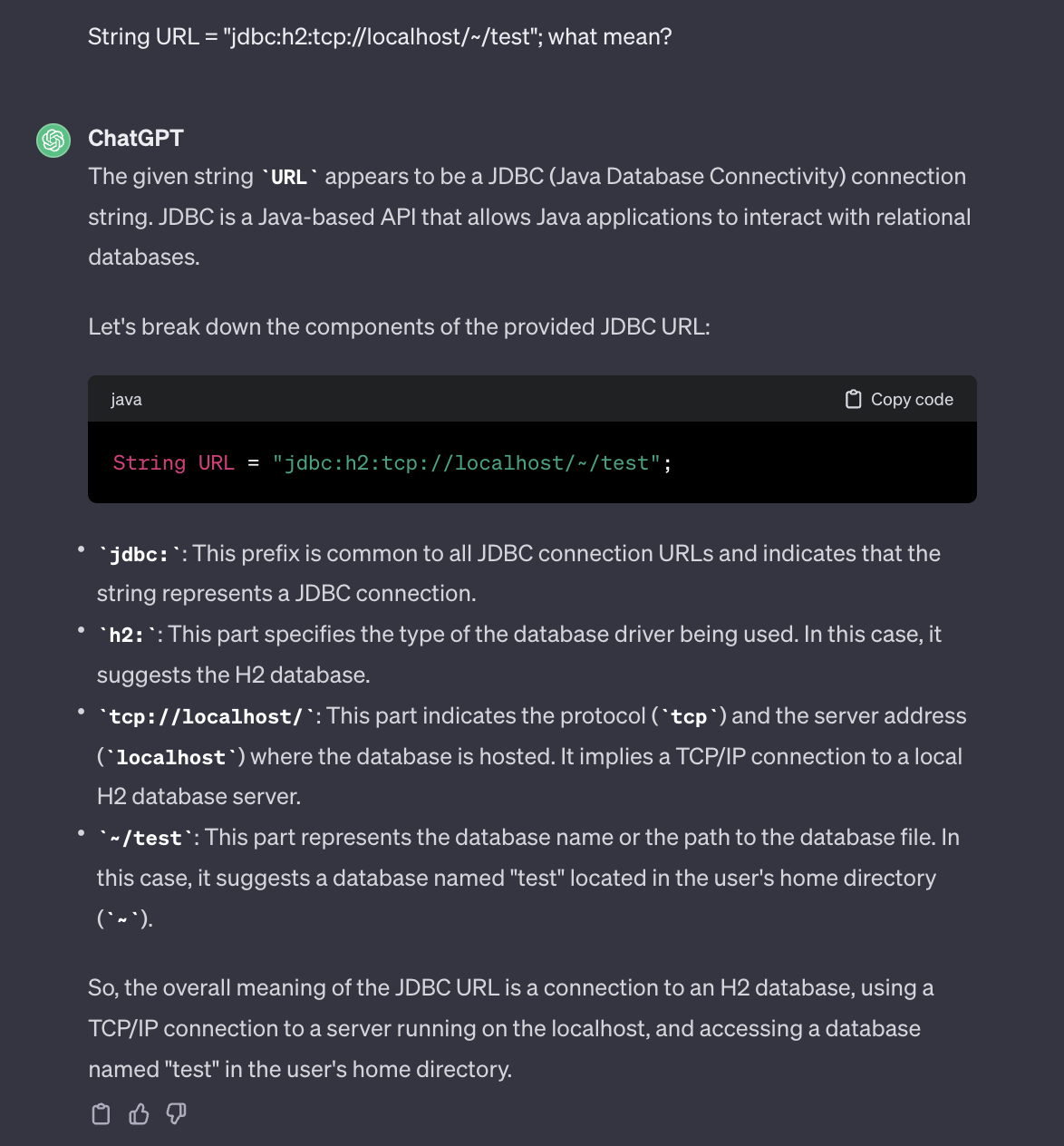 - tcp:://localhost/ : 이 부분은 데이터베이스가 호스팅되는 서버의 프로토콜(tcp)과 주소 (localhost)를 나타낸다. 로컬 h2 데이터베이스 서버에 대한 TCP/IP 연결을 나타낸다.