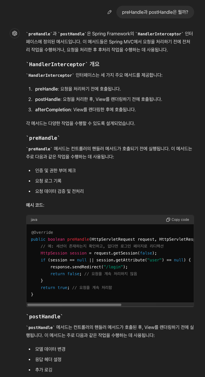 일단은 preHandle과 postHandle에 대해 chatGPT 검색해봤고 spring MVC 요청의 전처리, 후처리라는 것을 알 수 있었다.