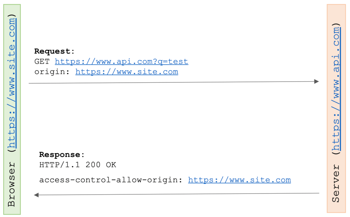 ๋ธ๋ผ์ฐ์ ๋ ์์ฒญ์ Origin ํค๋์ ๋ด๊ธด ์ถ์ฒ ์ ๋ณด๊ฐ ์๋ต์ Access-Control-Allow-Origin ํค๋์ ๋ด๊ฒจ์์ผ๋ฉด ํด๋น ์์ฒญ์ ์์ ํ๋ค๊ณ ๊ฐ์ฃผํ๊ณ ์๋ต์ ๊ฐ์ ธ์จ๋ค. ๋ง์ฝ ๊ทธ๋ ์ง ์๋ค๋ฉด, ๋ธ๋ผ์ฐ์ ๊ฐ ํด๋น ์๋ต์ ์์๋ก ํ๊ธฐํ๊ณ ์๋ฐ์คํฌ๋ฆฝํธ๋ก ์๋ต์ ๋ด์ฉ์ ์ ๋ฌํ์ง ์๋๋ค.