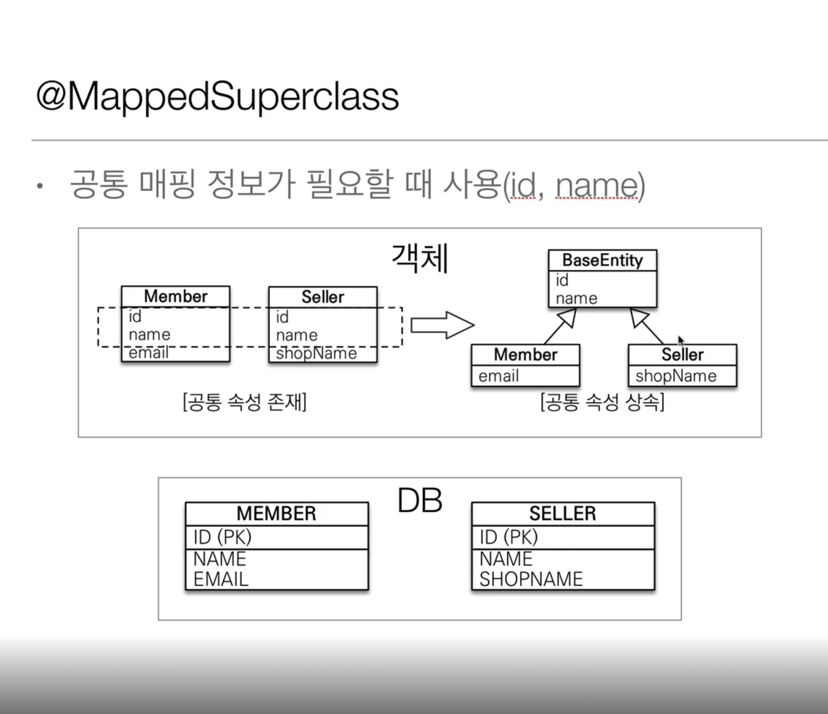 - ์ฐธ๊ณ : @Entityํด๋์ค๋ ์ํฐํฐ๋ @MappedSuperclass๋ก ์ง์ ํ ํด๋์ค๋ง ์์ ๊ฐ๋ฅ.