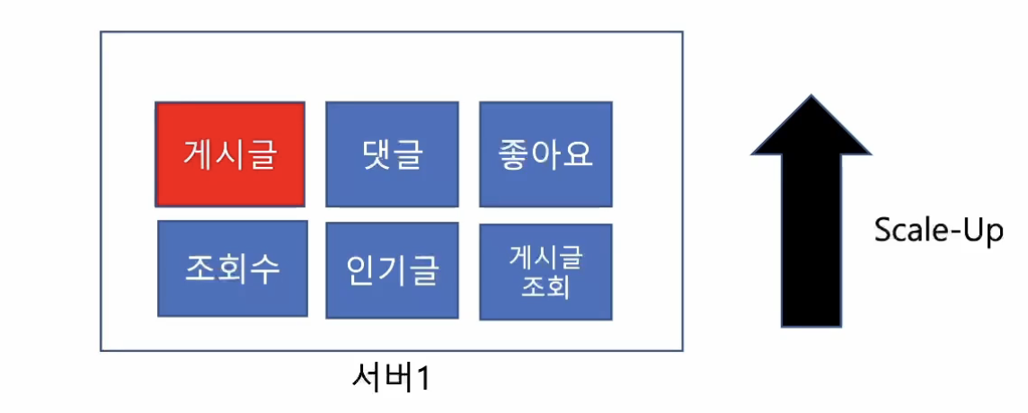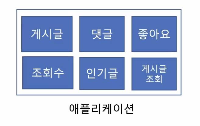 → ex) ํ์๊ฐ์ , ๊ฒ์ํ, ๋๊ธ, ๊ฒฐ์ ๊ธฐ๋ฅ → ๋ชจ๋ ํ๋์ Spring Boot ์ฑ์ ์์